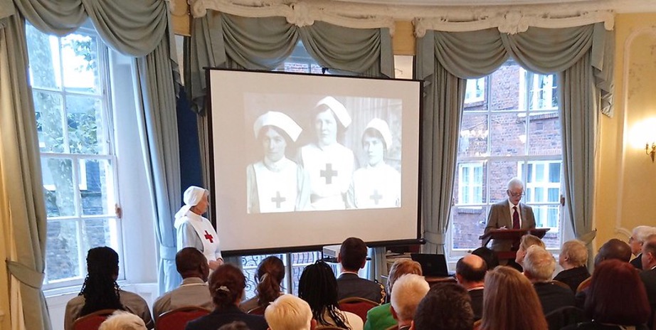 The event included a presentation on ‘Yesterday’s Front Line’ from John Drewry, Patron of the Nursing Memorial Appeal, and actress Eunice Drewry, featuring VAD nurses’ accounts from the First World War, through their journals, diaries and letters home. Brigadier (Retd) Alison McCourt CBE ARRC spoke about ‘Today’s Front Line’ through her experiences of setting up Ebola treatment centres in Sierra Leone and her work in the UK during the covid pandemic. The presentation finished with ‘Tomorrow’s Front Line’, the future of conflict, humanitarian & crisis nursing, from Sonja Curtis, Trustee and Secretary of the NMA, who established the charity twelve years ago.